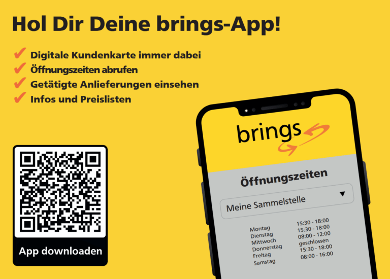 Die brings Kundenportal App bringt Ihnen lauter Vorteile! Damit hat man die brings Karte immer handlich dabei, kann die Waagscheine direkt auf der App einsehen, und die Preisliste ist auch gleich mit inbegriffen. Probieren Sie es aus!