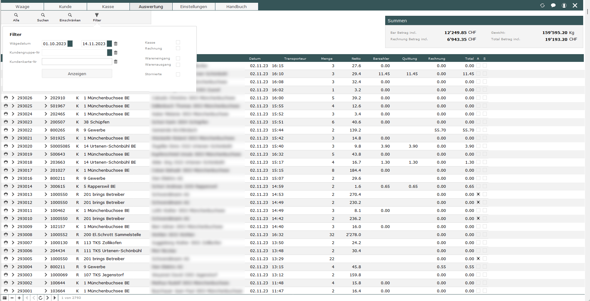 Das Wägen auf der Waage und die Zuweisung an Kunden geht mit wenigen Klicks oder per Touch einfach von der Hand. Wägung, Waagscheinerstellung, Abrechnung und Bezahlung werden rasch und ohne lange Wartezeiten erledigt.